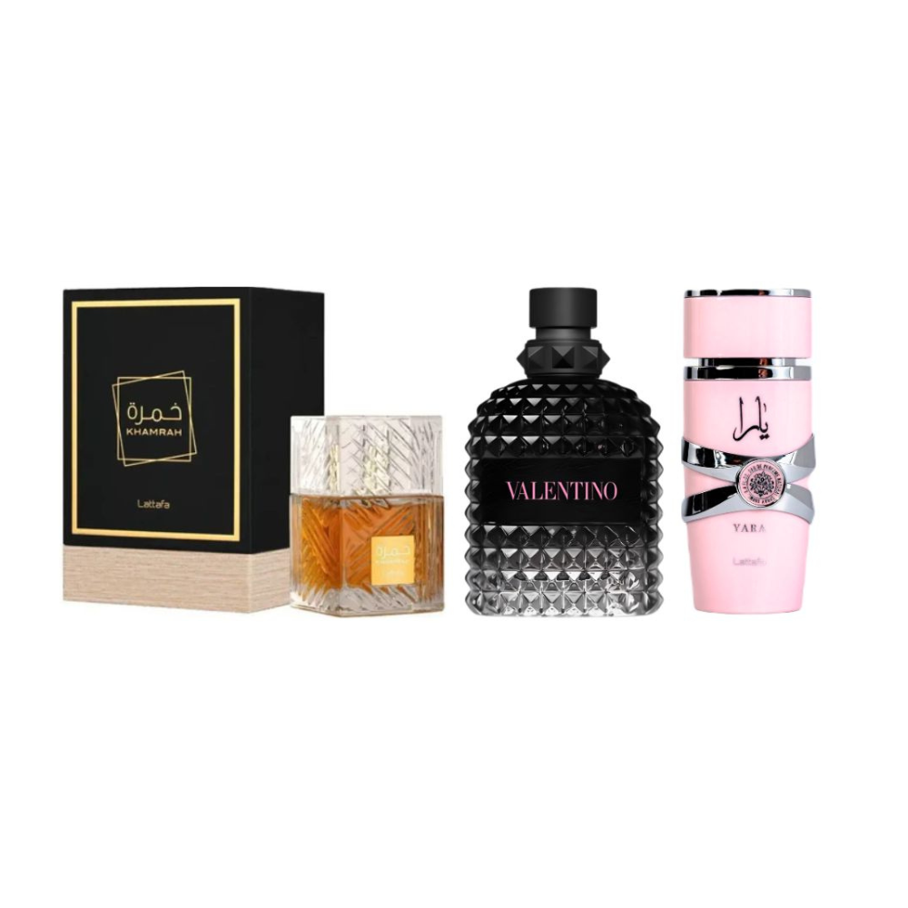 Khamrah 1.1, Valentino Born In Roma 1.1 y Yara 1.1 crean una combinación irresistible de dulzor gourmand especiado, elegancia moderna y cremosidad floral. Un combo perfecto para quienes aman los aromas sensuales, llamativos y con un toque de lujo juvenil.